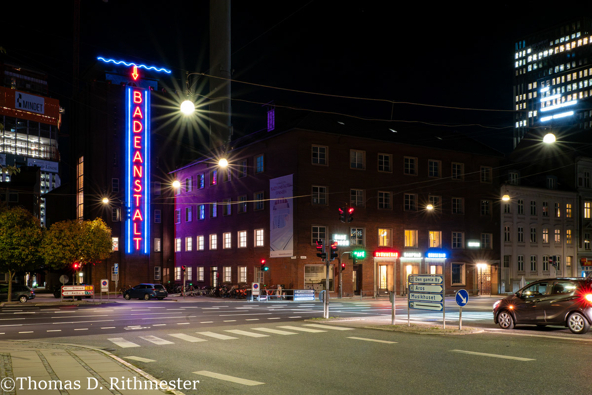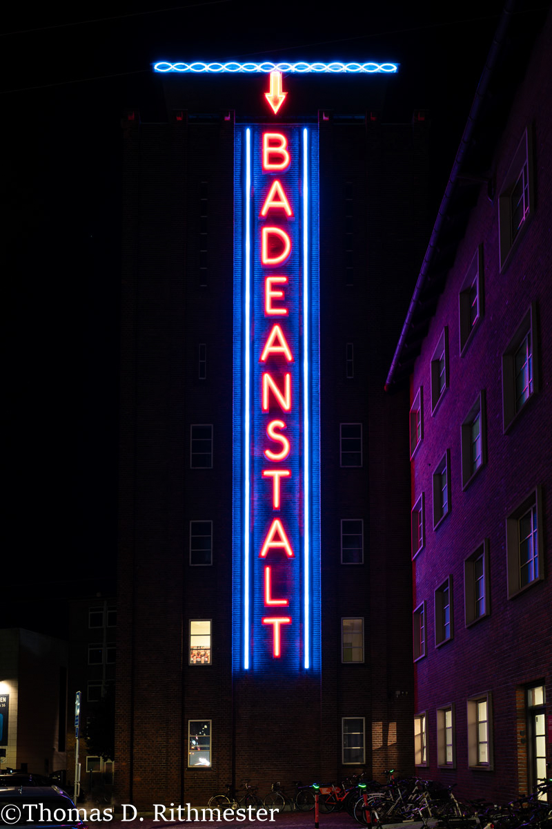 Detailfoto af neonskilte på Badeanstalten 'Spanien' i Aarhus.