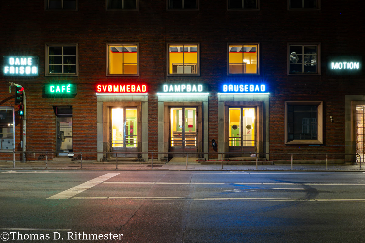 Detailfoto af neonskilte på Badeanstalten 'Spanien' i Aarhus.