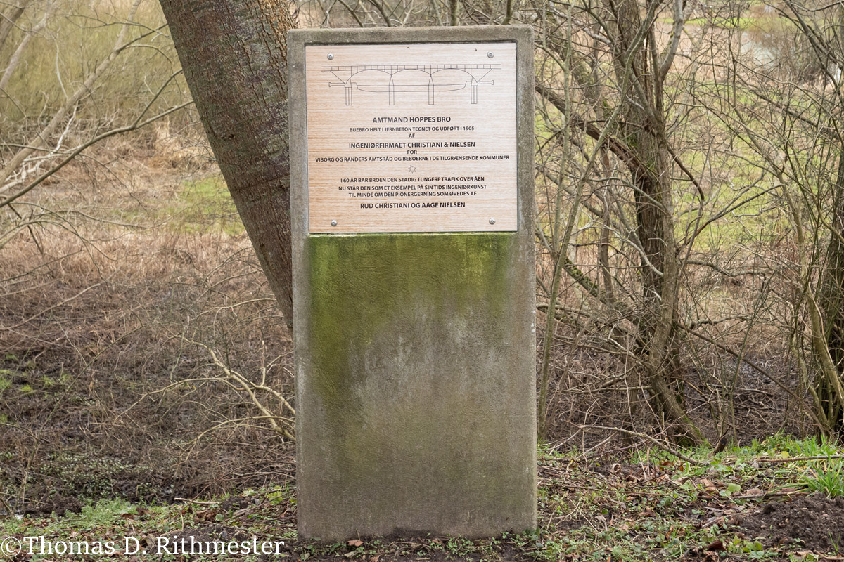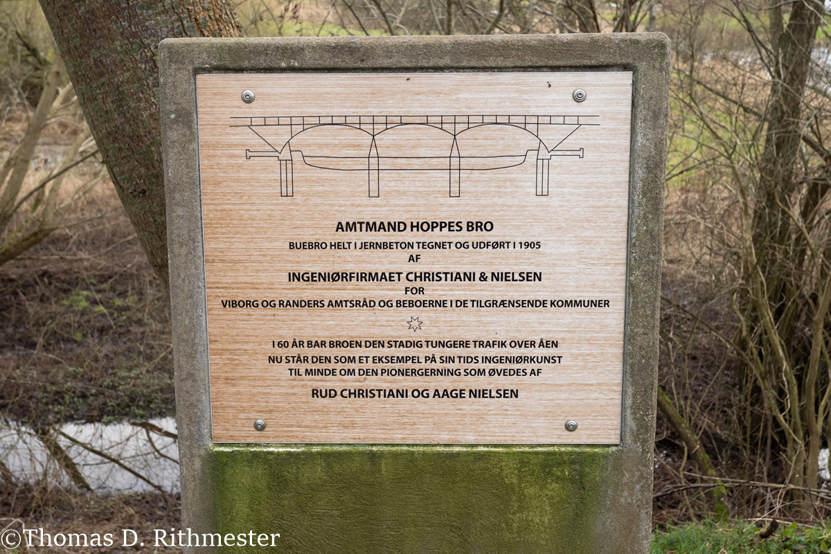 Amtmand Hoppes Bro for Gudenå ved Langå - detailfoto af skiltet med broens historie.
