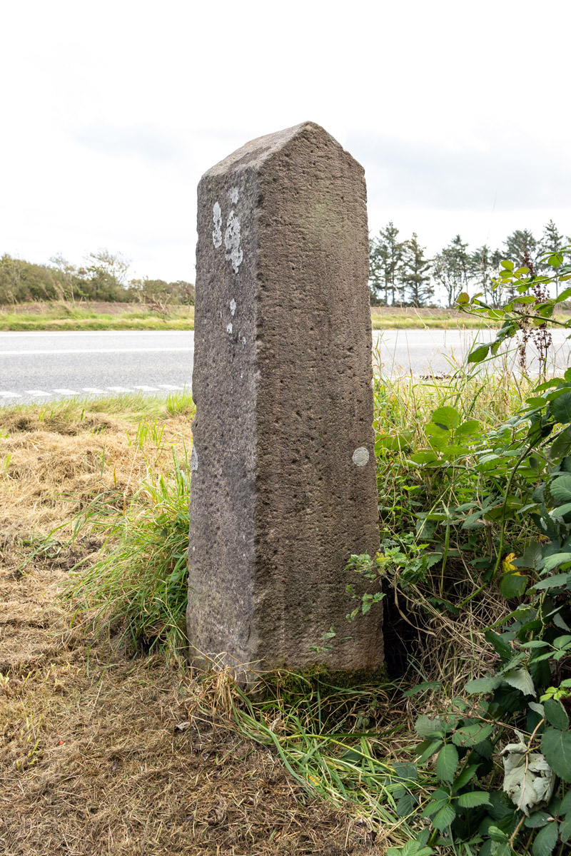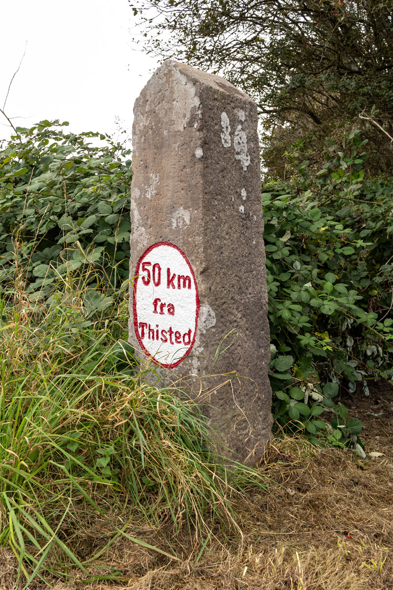 Kilometerstenen står ved en rasterplads på Hovedvejen (A11).